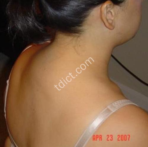 “Symptoms include obesity of the trunk and face (”moon face“), muscle wasting, high blood pressure, easy bruising, osteoporosis, diabetes mellitus, and fat between the shoulders (”buffalo hump “).”