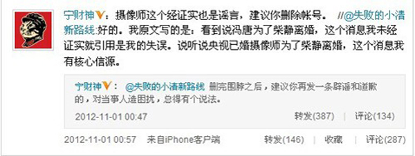 2012年11月1日,宁财神在微博表示,冯唐与柴静在一起是假消息。